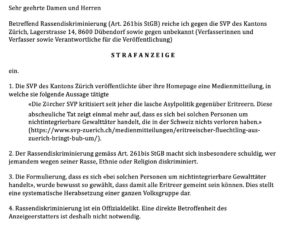 Wir, Linke PoC [1], haben deshalb Strafanzeige wegen Rassendiskriminierung nach Art. 261bis des Schweizerischen Strafgesetzbuches bei der Staatsanwaltschaft des Kantons Basel-Stadt (nach Stand des Servers) eingereicht, und gehen davon aus, dass es zu einer Verurteilung kommen wird. Wir wollen aber betonen, dass wir Strafanzeigen nicht als Lösung des Rassismus-Problems betrachten, welches tief in der Gesellschaft wurzelt; Behörden sind darin in der Regel Akteure von strukturellem Rassismus. Mit strukturellem Rassismus meinen wir die gesellschaftliche Benachteiligung von Ausländer*innen, besonders nicht-weissen Ausländer*innen, welche sich insbesondere in impliziten Vorurteilen, Racial Profiling, diskriminierender Rechtsetzung, und wirtschaftlichen Hürden äussert Die rassistischen Aussagen der rechts-nationalistischen Zürcher SVP ist nur ein Ausdruck deren langandauernden rassistischen Politik, welche auf Diskriminierung, rechtliche Schlechterstellung und Chauvinismus gegen Ausländer*innen und People of Colour aufbaut. Wir wollen aber betonen, dass Rassismus nicht nur ein Problem von politischen Akteuren am rechten Rand ist, sondern eines, welche die gesamte Gesellschaft betrifft, und nur auf gesellschaftlicher Ebene gelöst werden. Beispiele für unser Engagement sind unsere Beteiligungen an der Anti-KKK-Demo in Schwyz am 13. April dieses Jahres, am Frauenstreik-Block des 1. Mai in Zürich oder am Frauenstreik am 14. Juni 2019. Und wir fordern dazu auf, immer dort zu intervenieren – sei es auf der Strasse, auf der Arbeit oder zuhause –, wo rassistisches Verhalten spürbar oder sichtbar ist.