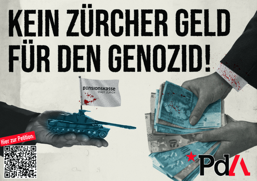 sit. «Kein Zürcher Geld für den Genozid»: Mit dieser Petition fordert die Partei der Arbeit, dass die indirekte Mitfinanzierung des Genozids in Palästina durch die Pensionskasse der Stadt Zürich unverzüglich gestoppt wird. Denn diese investiert Gelder in Finanzinstitute, die am Völkermord beteiligt sind.