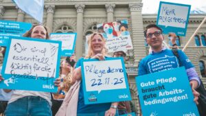Setzt die «Pflegeinitiative» endlich um! Dies fordert die Kundgebung am 22.November 2025, bei der Aktivist:innen und Personal zusammen für die Sicherheit der Versorgung und für eine angemessene Arbeitssituation des Gesundheitspersonals kämpfen. Denn im November 2021 stimmten über 60 Prozent der Stimmbevölkerung zu, dass die Pflegeinitiative (Initiative «für eine starke Pflege») bald umgesetzt wird. Ein sicherer Stellenschlüssel, anforderungsgerechte Arbeitsbedingungen und eine ausreichende Finanzierung sind jedoch immer noch nicht realisiert. So herrschen im Gesundheitswesen weiterhin katastrophale Zustände und der Bedarf an Behandlungen nimmt zu. Vom Gesundheits- und Pflegepersonal wird nach wie vor viel abverlangt. In der «Pflege» arbeitende Menschen sind stark überlastet. Wer diese Situation nicht aushalten kann, verlässt bald darauf den Beruf. Eine Folge davon ist der Personalmangel.